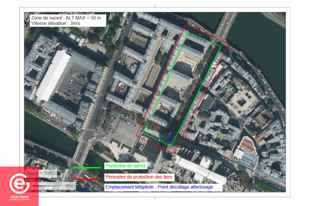 Dans le cadre de la réponse à un appel d’offre stratégique, Bouygues Bâtiment a sollicité le cabinet GE3D pour capturer des images aériennes du site, permettant de mettre en avant leur vision du projet. Le décollage s’est effectué à proximité de la cathédrale Notre-Dame de Paris, dans un environnement urbain exigeant une coordination rigoureuse et des mesures de sécurité strictes.